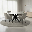 The 130cm round dining table showcases a beautiful white marble effect top with natural veining, creating an eye-catching centerpiece. The sleek black metal starburst base adds modern industrial style while providing exceptional stability. Comfortably seats 4 people for everyday dining, expandable to 6 for gatherings.